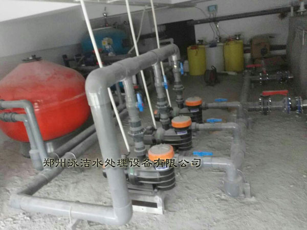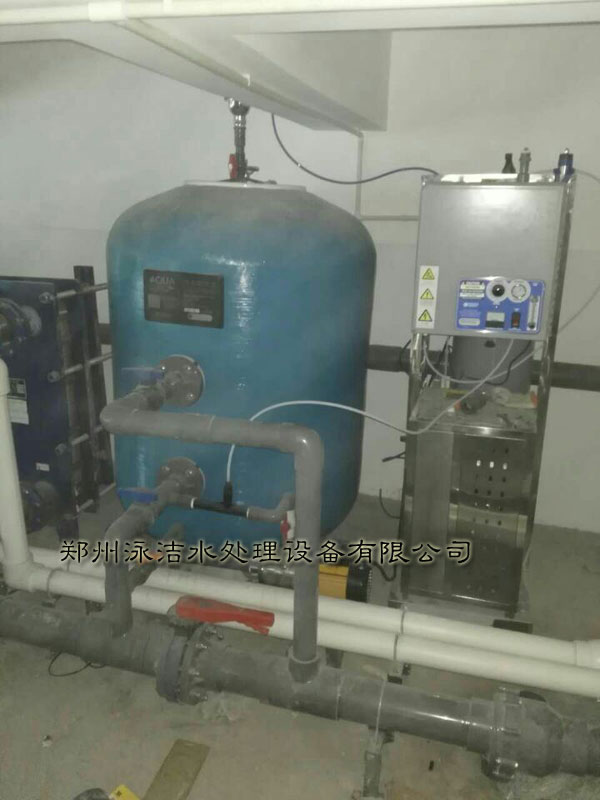 機房內(nèi)部已經(jīng)安裝完畢、次游泳池采用的是逆流式、采用的是砂缸循環(huán)過濾系統(tǒng)、臭氧反應(yīng)器、板式換熱器、水箱等游泳池水處理設(shè)備